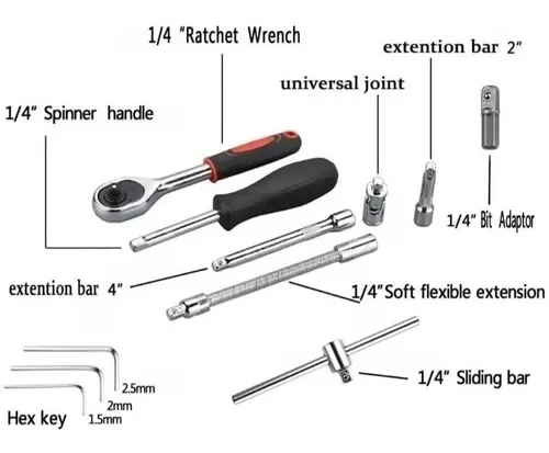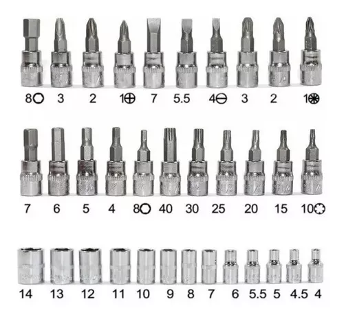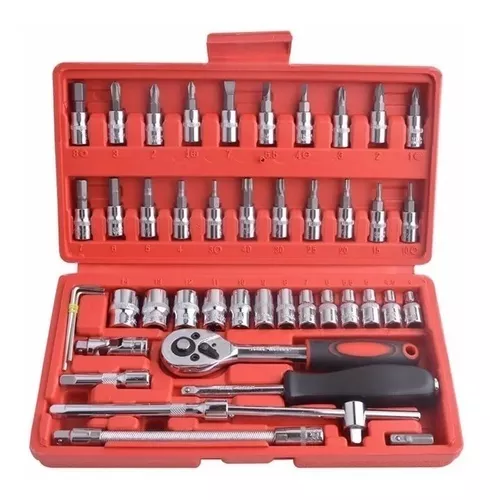 46 UNIDS 1/4 "DR. JUEGO DE LLAVES DE VASO Juego de llaves de vaso Juego de llaves de vaso 1/4" Herramienta de llave de trinquete 46 piezas – Tamaño de la caja: 24 x 12,5 x 4,5 cm Aprox. – Material: Acero al carbono – Color: Como muestra la imagen – Adaptador de puntas – Enchufes de puntas SL 4, 5.5, 7 – Enchufes de puntas PH 1, 2, 3 – Enchufes de puntas PZ 1, 2, 3 – Enchufes de puntas Hex 3, 4, 5, 6, 8 – Vasos T 10, 15, 20, 25, 30, 40 – Vasos de 1/4 "4, 4.5, 5, 5.5, 6, 7, 8, 9, 10, 11, 12, 13, 14 mm – Llaves hexagonales de 1,5, 2, 2,5 mm – Junta universal de 1/4 "- Barra de extensión de 1/4" x2 – Barra de extensión de 1/4 "x4 – Barra de extensión de 1/4" x6 – T deslizante de 1/4 " Barra – Mango de trinquete rápido de 1/4 "- Mango giratorio de 6" – Estuche de transporte resistente