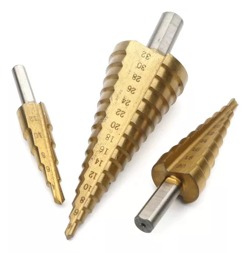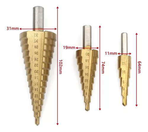 Broca de 15 escalones: 4-32 mm ( 4 mm, 6 mm, 8 mm, 10 mm, 12 mm, 14 mm, 16 mm, 18 mm, 20 mm, 22 mm, 24 mm, 26 mm, 28 mm, 30 mm, 32 mm )